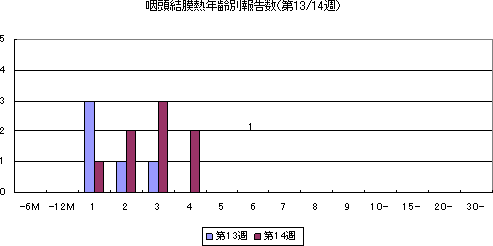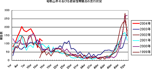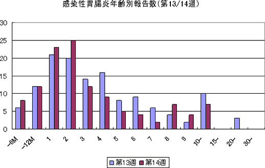インフルエンザの流行に伴うように増加した感染性胃腸炎は,第 5 週では昨年より多い 203 件の報告がありピークとなり,第 11 週より減少傾向を示し,第 12 週で警報解除されました。第 14 週は 113 件の報告でした。例年と同様に増減しつつ徐々に終息に向かっていくものと思われます。