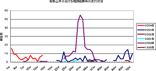 | 冬場の流行は少ない「咽頭結膜熱」ですが,今冬は,昨年末から引き続き報告があります。第13週では和歌山市6件,岩出4 件,第14 週では和歌山市8件,岩出6件の報告があり,両地域で警報が継続発令されています。