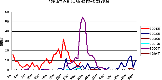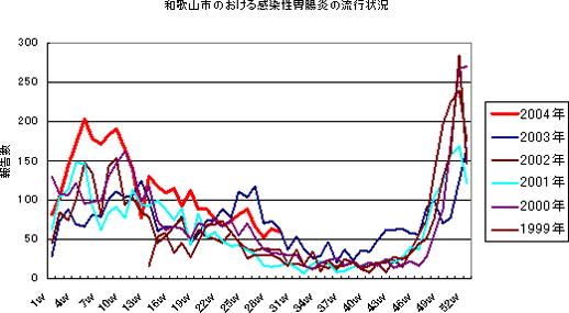感染性胃腸炎関連のウィルスとしては,ノロウィルスが多く報告されます。2004年4〜5月には,大阪市でノロウィルスによる胃腸炎の集団発生がありました。また,島根県でも5月下旬に小学校で集団胃腸炎が発生し,IDWR2004年第25週に報告されています。 和歌山市内でも小学校等で,ノロウィルスによると思われる胃腸炎の小流行がありました。 |