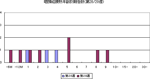 第15週から報告が増加しており,例年にない流行となり,第22週では32件(定点当り3.56)と急増しましましたが,第23週以降減少傾向にあり,第28週では3件まで減少したものの,第29週では8件に増加しています。