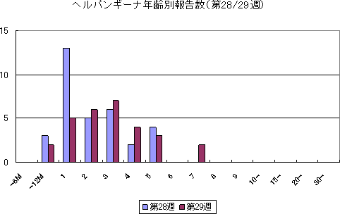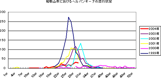 | 「咽頭結膜熱」「手足口病」とともに3大夏風邪のひとつ「ヘルパンギーナ」も,これからの流行が予想される感染症のひとつです。全国的にも和歌山市内でも,5年前に大流行しました。ことしは,和歌山市内では,第22週の24件,以降増減していましたが,第28週33件(定点当り3.67),第29週では19件でした。今後の流行状況に注意しましょう。 年齢別では,0歳2件,1歳5件,2歳6件,3歳7件,4歳4件,5歳3件,7歳2件でした。