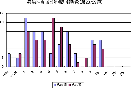 インフルエンザの流行に伴うように増加した感染性胃腸炎は,第5週では昨年より多い203件の報告がありピークとなり,第11週より減少傾向を示し,第12週で警報解除されました。第28週では63件で,ほぼ例年なみの状況となっています。