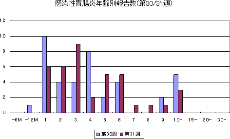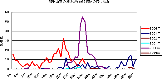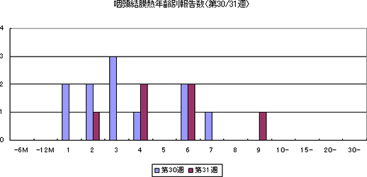 和歌山市では,第15週から報告が増加し,例年にない流行となり,第22週では32件(定点当り3.56)と急増,第23週以降減少傾向にありつつも増減しています。第30週11件,第31週6件(定点当り0.67)でした。