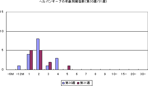 「水痘(みずぼうそう)」:和歌山市第30週7件,31週では35件(定点当り3.89)と報告数が増加しています。1歳4件,2歳9件,3歳3件,4歳9件,5歳8件,6歳2件です。 |