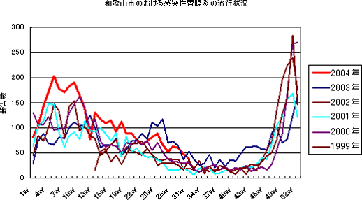 感染性胃腸炎関連のウィルスとしては,ノロウィルスが多く報告されます。2004年4〜5月には,大阪市でノロウィルスによる胃腸炎の集団発生がありました。また,島根県でも5月下旬に小学校で集団胃腸炎が発生し,IDWR2004年第25週に報告されています。 和歌山市内でも小学校等で,ノロウィルスによると思われる胃腸炎の小流行がありました。 |