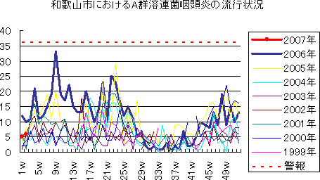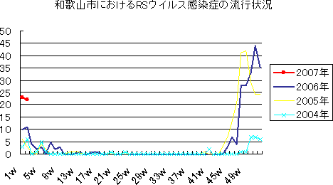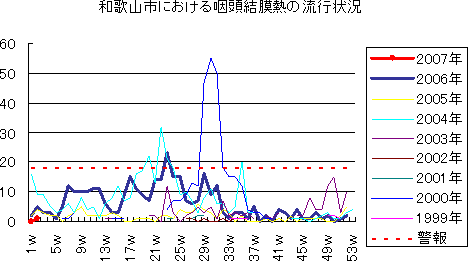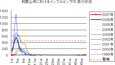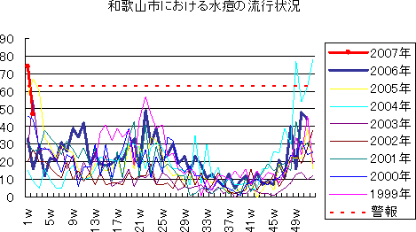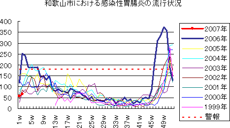 和歌山市では、2006年では、第46週で211件(定点当り23.44)と急増し、警報発令となりました。これは前年より5週間早い警報発令です。第47週はさらに310件(定点当り34.44)と約1.5倍に増加、その後も第48週は332件(定点当り36.89)、第49週373件(定点当り41.44)と増加し、過去最高の報告数となりました。以後、第50週は358件にやや減少、以後、第51週には190件(定点当り21.11)、第52週には130件(定点当り14.44)と急激に減少しました。