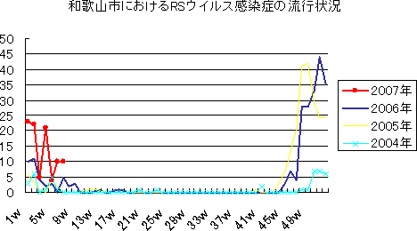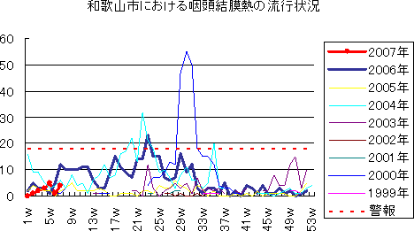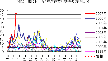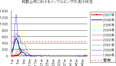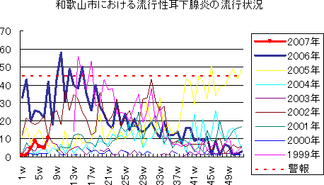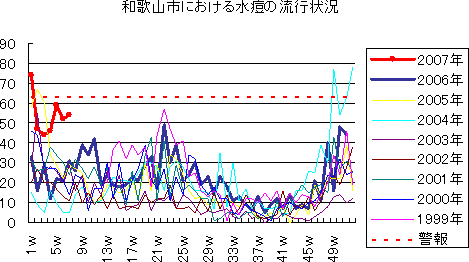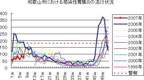 和歌山市でも、2006年は、第46週で211件(定点当り23.44)と急増し、警報発令となりました。これは前年より5週間早い警報発令です。以後急増し、第49週には373件(定点当り41.44)と過去最高の報告数となりました。以後、第50週は358件にやや減少、以降、第51週190件(定点当り21.11)、第52週130件(定点当り14.44)と急激に減少しました。