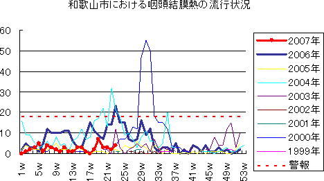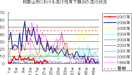 和歌山市でも、2006年は、第49週に373例(定点当り41.44)と過去最高の報告数となり,第46週から52週まで警報発令が続きました。