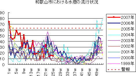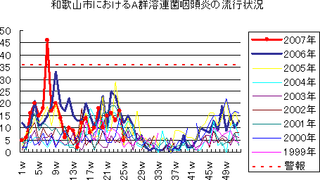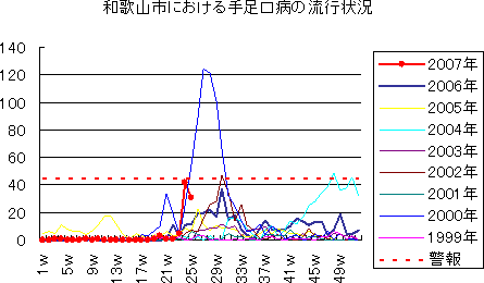 和歌山市でも、2006年は、第49週に373例(定点当り41.44)と過去最高の報告数となり,第46週から52週まで警報発令が続きました。