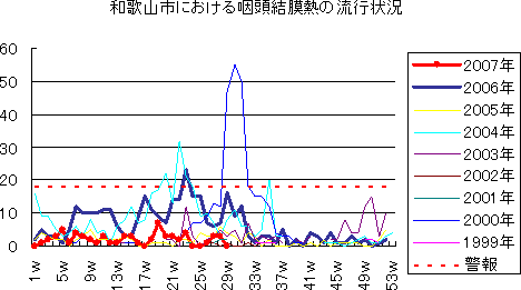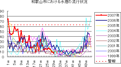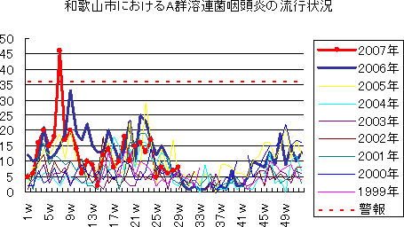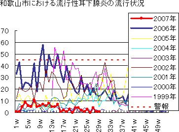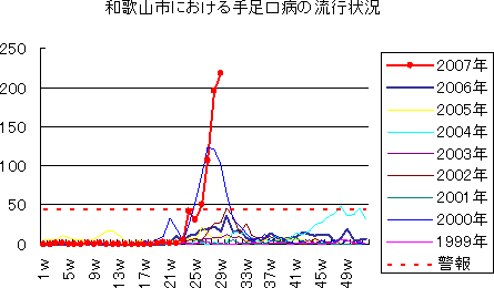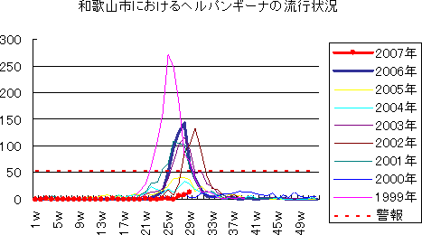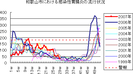 和歌山市でも、2006年は、第49週に373例(定点当り41.44)と過去最高の報告数となり,第46週から52週まで警報発令が続きました。