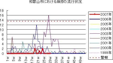 和歌山県・市では,感染症発生動向調査と並行し,2005年5月より,麻しんと風しんの全数把握事業を実施しています。和歌山市内では、2005年6月以降2007年第18週まで、麻しん・風しんとも報告はありませんでした。