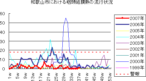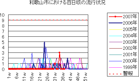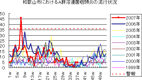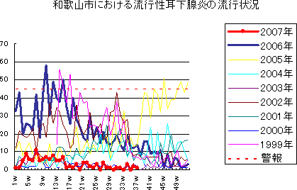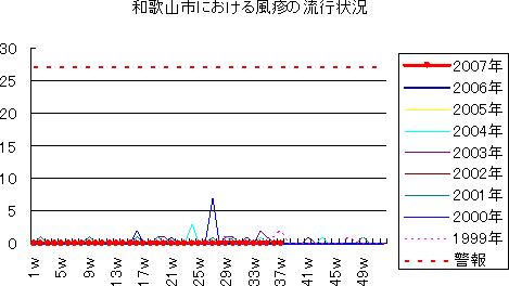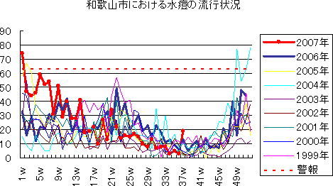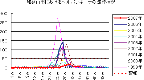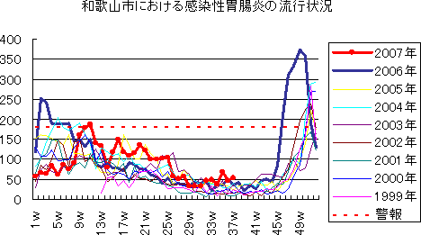 和歌山市でも、2006年は、第49週に373例(定点当り41.44)と過去最高の報告数となり,第46週から52週まで警報発令が続きました。