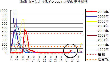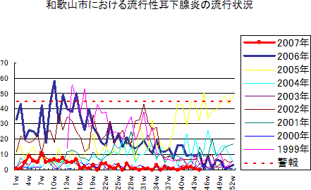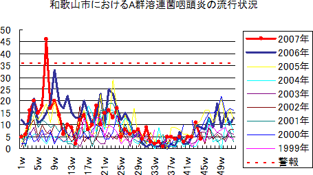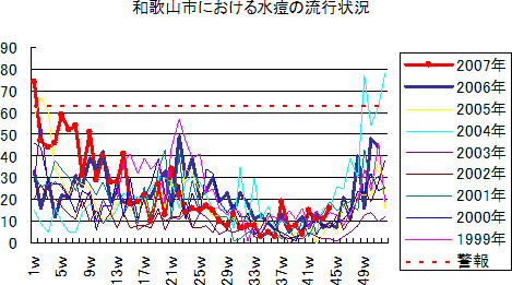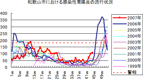 2006年は、全国的に例年より立ち上がりが早く、第46週時点で1定点あたり19.80と1981年の調査開始以来最高を記録しました。和歌山市でも、2006年は、第49週に373例(定点当り41.44)と過去最高の報告数となり,第46週から52週まで警報発令が続きました。