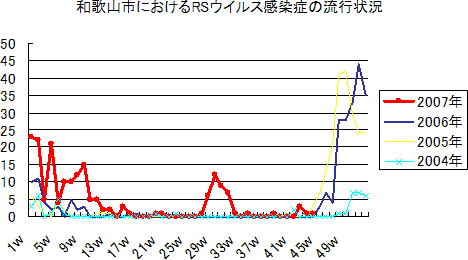 RSウイルス感染症の流行は毎年冬で、特に乳幼児(特に6ヶ月未満)に中心にみられる肺炎、気管支炎などの急性下気道感染症です。ロタウイルス腸炎と並んで、冬季に流行する乳幼児に多い感染症です。2006年では第45週以降報告が続き、第51週44件でピークとなりました。
