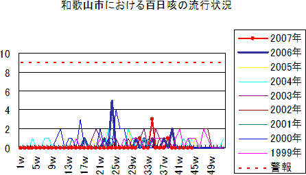 2007年では、第31週に初めて1例の報告があった百日咳ですが、第34週には3例、第28週1例の報告がみられています。第39週以降の報告はありません。
