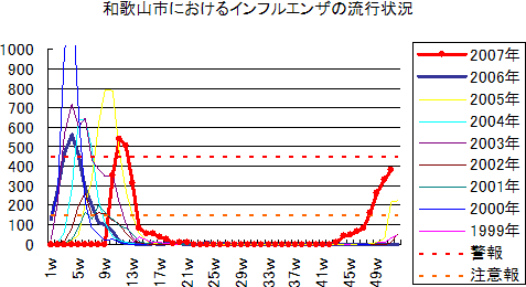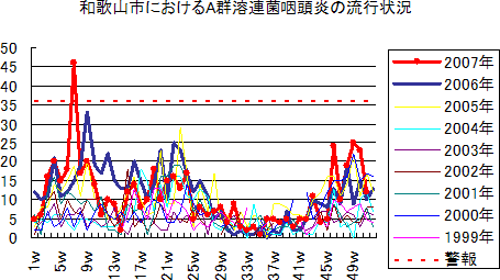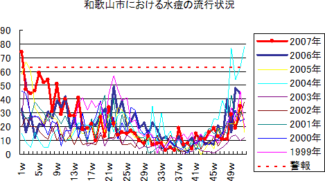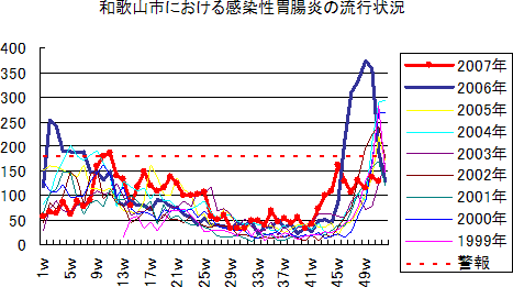 2006年は、全国的に例年より立ち上がりが早く、第46週時点で1定点あたり19.80と1981年の調査開始以来最高を記録しました。和歌山市でも、2006年は、第49週に373例(定点当り41.44)と過去最高の報告数となり,第46週から52週まで警報発令が続きました。