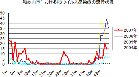 和歌山市では,2006年では第10週をピークに流行が続きましたが、第19週以降漸減しています。2007年では第15週までの期間1〜11件を推移していましたが、その後は5件以下と例年以下の状況が続いていましたが、第45週は7件の報告がありました。その後は第46週に1件、第47〜50週では報告なし、第51週2件でした。