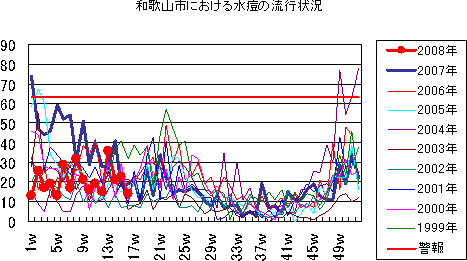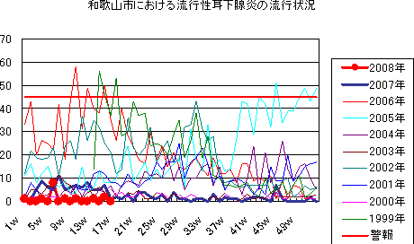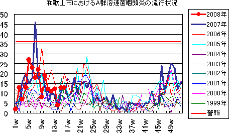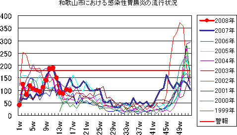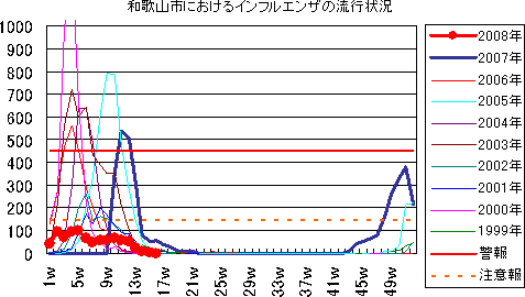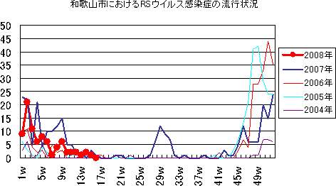 今シーズンは、2007年−2008年の流行は、スタートが例年よりかなり早く、年末には減少傾向で、2008年に入ってからは100件程度を超えることなく、徐々に終息に向いました。第14週には、和歌山市で8件、和歌山県内でも10件と減少し、流行は終息しました。第16週は和歌山市で2件、和歌山県内で4件でした。