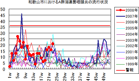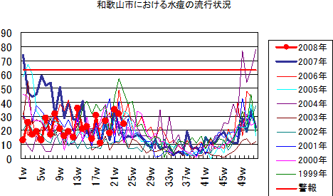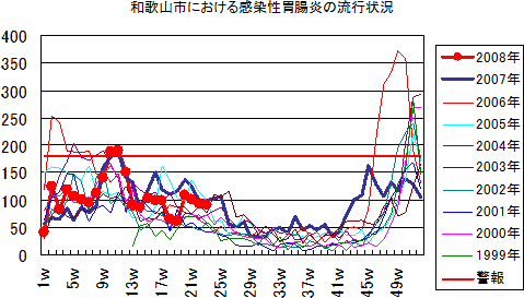 2008年第23週の和歌山市の5類感染症(定点把握)の発生状況です。