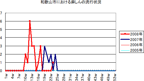 2007年 和歌山市において第19〜23週にかけて、計10件報告がありました。成人の3件はいずれもワクチン接種歴不明、小児は6件がワクチン接種なし、1件がワクチン接種済みでした。