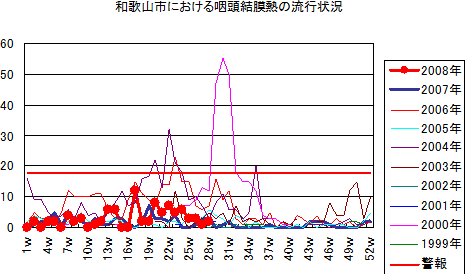 和歌山市では,2006年では第10週をピークに流行が続きましたが、第19週以降漸減しています。2007年では第15週までの期間1〜11件を推移していましたが、その後は5件以下と例年以下の状況が続いていましたが、第45週は7件の報告がありました。2008年は、第27週は11件(定点当たり1.22)と増加していましたが、第28週は3件と減少しました。
