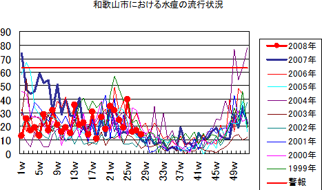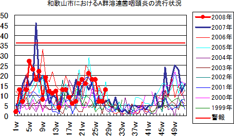 第13週に15件から36件へ増加し、注意報が発令されました。以降、増減しつつほぼ例年並の状況でした。第25週40件(定点当たり4.44)と増加しましたが、第27週には17件、第28週には14件と減少しました。和歌山市保健所管内(第25週)、新宮保健所管内(第26週)、岩出保健所管内(第27週)の注意報はそれぞれ解除されました。過去5年(2003~2007年)の患者報告数の推移を見るとこれから患者は減少に向かうことが予想されますが、依然注意が必要です。