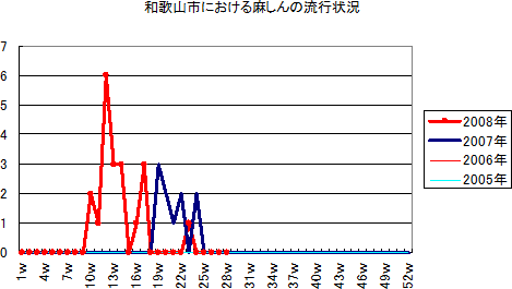 2007年 和歌山市において第19〜23週にかけて、計10件報告がありました。成人の3件はいずれもワクチン接種歴不明、小児は6件がワクチン接種なし、1件がワクチン接種済みでした。