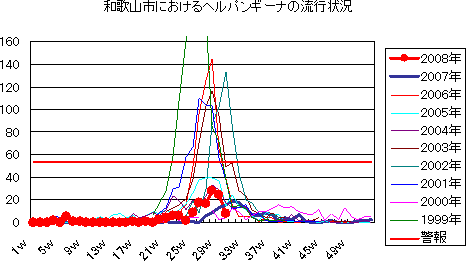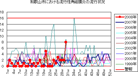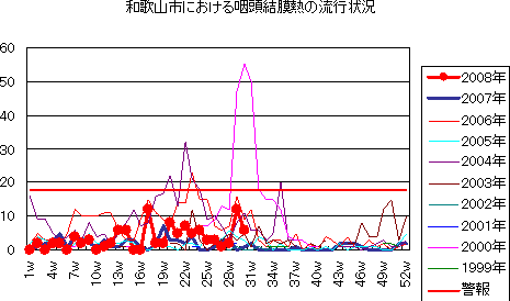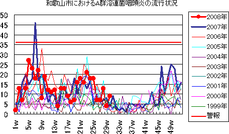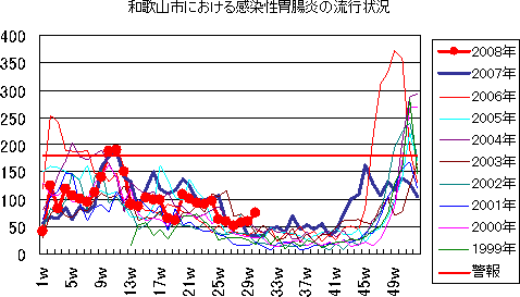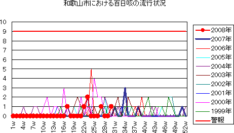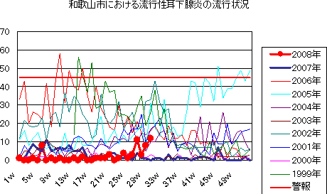 2008年では、第28週:28件、第29週:25件と流行の兆しが見られたものの、第30週では8件に減少しています。 今しばらく注意しましょう。