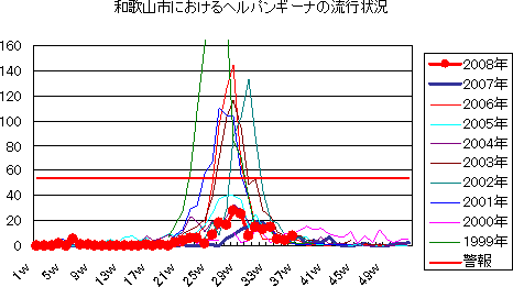 夏風邪の代表ですが、2008年は、第17週で12件の報告がありました。例年と比較して早めの立ち上がりと思われましたが、以降は5件前後で横ばい状況が続きました。第29週に12件と増加しましたが、以後減少し、大きな流行にはつながりませんでした。第35週1件だったのが、36週は2件へとやや増加傾向です。引き続き注意が必要です。