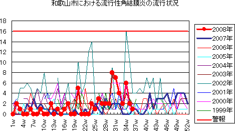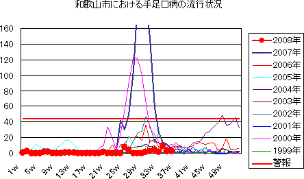 和歌山では、2008年は、例年と比較して報告が少なめです。第28週:28件(定点あたり3.11)、第29週:25件と小さめのピークが見られたものの、その後減少しました。第36週は8件のみで、大きな流行にはなりませんでした。