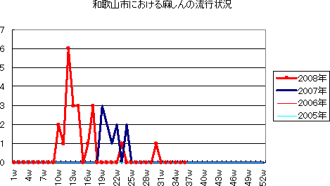 また,「風疹」は,和歌山市内では,2004年7件,2005年4件の報告でした。2008年第3週で5年ぶりに1件の報告がありました。