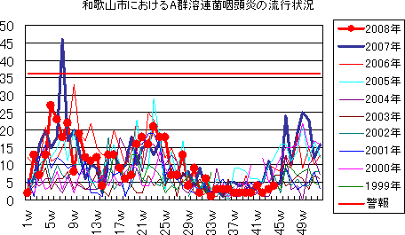 和歌山市では、2006年では第10週をピークに流行が続きましたが、第19週以降漸減しています。2007年では第15週までの期間1〜11件を推移していましたが、その後は5件以下と非常に少ない状況が続きました。