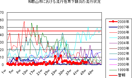 2007年 和歌山市において第19〜23週にかけて、計10件報告がありました。成人の3件はいずれもワクチン接種歴不明、小児は6件がワクチン接種なし、1件がワクチン接種済みでした。