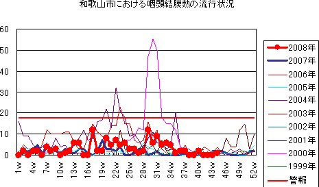 夏風邪の代表ですが、2008年は、第17週、29週に各々12件と増加しましたが、大きな流行にはつながりませんでした。第39週以降は0件〜2件までの報告にとどまっています。