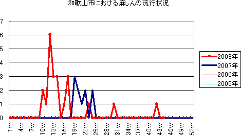 また,「風疹」は,和歌山市内では,2004年7件,2005年4件の報告でした。2008年第3週で5年ぶりに1件の報告がありました。