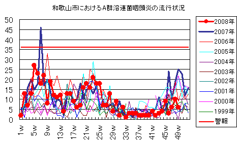 2008年に入り、第5週に27件に急増、その後徐々に減少し10件前後で推移していたものの、第20週頃より再び20件前後の報告が続いた後、第25週より減少し、例年通り二峰性のピークを描きました。第33週以降は週あたり0〜4件の報告にとどまっていました。第49週は6件と報告数は少なめですが、今後注意が必要です。県内では岩出市と海南市で患者数が目立っております。