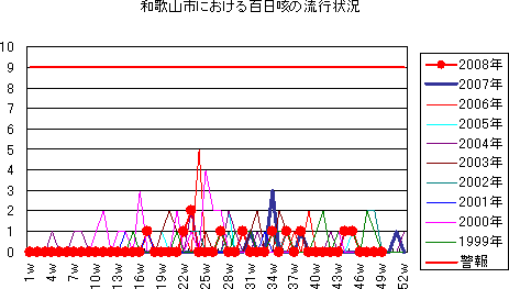 2008年も同様に少ない状況が続いています。第27週以降10件前後と一時的に増加傾向でしたが、第33週以降減少し、週数件程度の報告にとどまっており、第49週は報告がありませんでした。