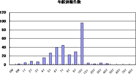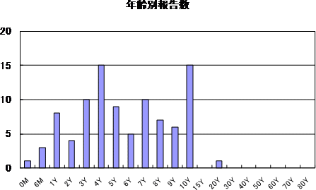 年齢別では、乳幼児から15歳までに集中していますが、20歳代の報告が認められています。