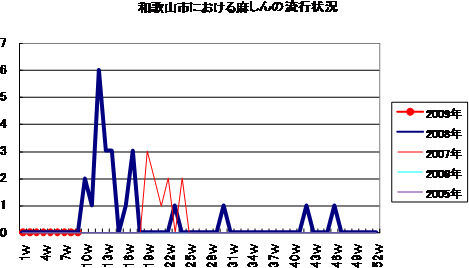 和歌山市では、2006年では第10週をピークに流行が続きましたが、第19週以降漸減しています。2007年、2008年とも大きな流行なく少数報告にとどまっています。2009年も、第9週4件です。