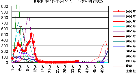 2009年では、第4週331件が第一のピーク、第11週497件が第二のピークとなり、この時には今シーズン初の警報が発令されました。しかし、以後急速に減少し、第21週2件、第22週1件の報告(いずれもB型インフルエンザ)を最後に、第23週以降の報告はありません。