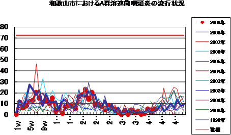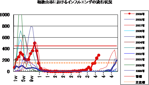 本年5月には、新型インフルエンザ(H1N1)の国内発生例があり、5月27日には和歌山市内で初めて新型インフルエンザ感染者が確認されました。6月後半以降は、全国的に感染者の確認が続き、集団感染事例も多数発生しました。第33週には、定点当たり1.69と増加し、流行の入口に達したと国は発表しました。