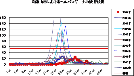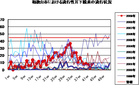 2009年は第21週19件以降増加傾向で、第31週35件となり注意報が発令されました。その後は第32週の37件をピークに減少に転じていまあす。第43週では8件でほぼ終息と思われます。