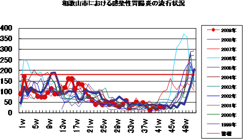 2009年第43週の和歌山市の5類感染症(定点把握)の発生状況です。