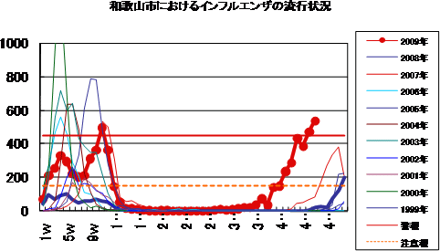 2009年では、第4週331件が第一のピーク、第11週497件が第二のピークとなり、この時には今シーズン初の警報が発令されました。しかし、以後急速に減少し、第21週2件、第22週1件の報告(いずれもB型インフルエンザ)を最後に、第23週以降の報告はありません。