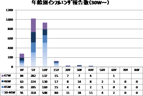 2009年初めでは、第2週11件の報告があり、以後、10件以内の報告がしばらく続きましたが、大きな増加はありませんでした。今シーズンでは、第41週から1〜2件の報告が続いていましたが、第44週には6件の報告あり、第45週も5件でした。第46週は0件でしたが、第47週は4件で年齢別では、6-11か月2件、1歳1件、2歳1件です。今後、増加の兆しがみられますので、注意しましょう。