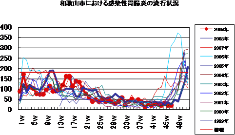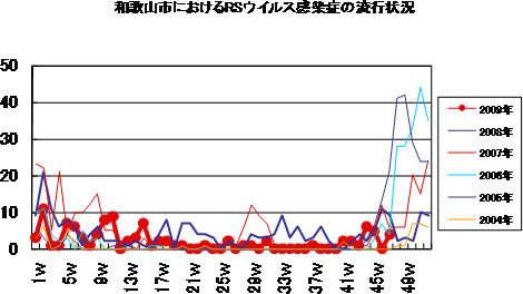 和歌山市では、2006年では第10週をピークに流行が続きましたが、2007年、2008年とも大きな流行なく少数報告にとどまっています。