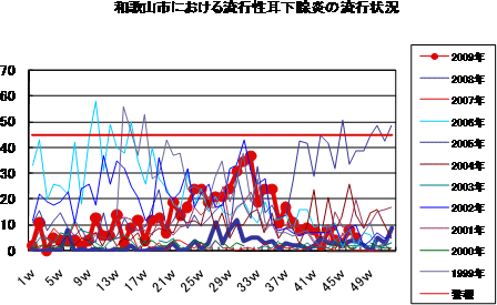本年5月には、新型インフルエンザ(H1N1)の国内発生例があり、5月27日には和歌山市内で初めて新型インフルエンザ感染者が確認されました。6月後半以降は、全国的に感染者の確認が続き、集団感染事例も多数発生しました。第33週には、定点当たり1.69と増加し、流行の入口に達したと国は発表しました。