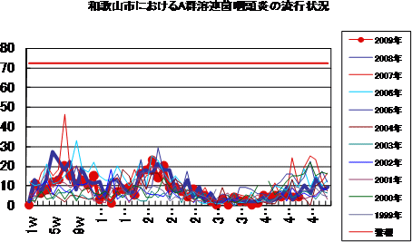 和歌山市でも、第35週に定点当たり報告数1.33と全国に遅れて流行が始まり、以後増加し、第42週で15.67と注意報発令されました。第43週は19.20、第44週は28.93とさらに増加しました。第45週は、25.6にやや減少しましたが、第46週は31.4に増加し、警報発令となりました。第47週はさらに35.8に増加しました。今後もさらなる流行が危惧されます。また第45週以降の特徴としては、これまで10-14歳の報告が最も多かったのが、5-9歳での報告が最も多くなり、低年齢化の傾向が明確です。市内の小・中学校を中心に学級閉鎖、学校閉鎖が相次いでいます。また、保育所や幼稚園での感染拡大も認められています。今後も十分な注意が必要です。