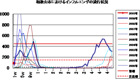 本年5月には、新型インフルエンザ(H1N1)の国内発生例があり、5月27日には和歌山市内で初めて新型インフルエンザ感染者が確認されました。6月後半以降は、全国的に感染者の確認が続き、集団感染事例も多数発生しました。第33週には、定点当たり1.69と増加し、流行の入口に達したと国は発表しました。