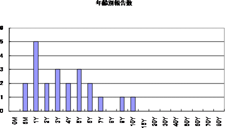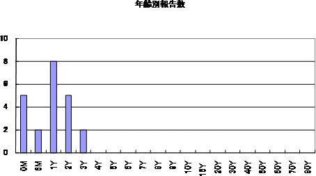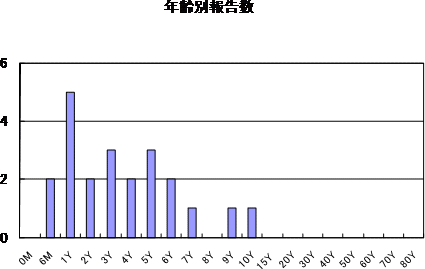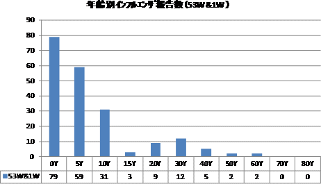 今シーズンは、非常に少ない状況が続いていましたが、例年より遅れ、第51週に40件、第52週64件、第53週54件、第1週で84件と増加傾向にあります。今後、さらなる増加が危惧されます。年齢別では、1〜6歳を中心に報告が見られます。